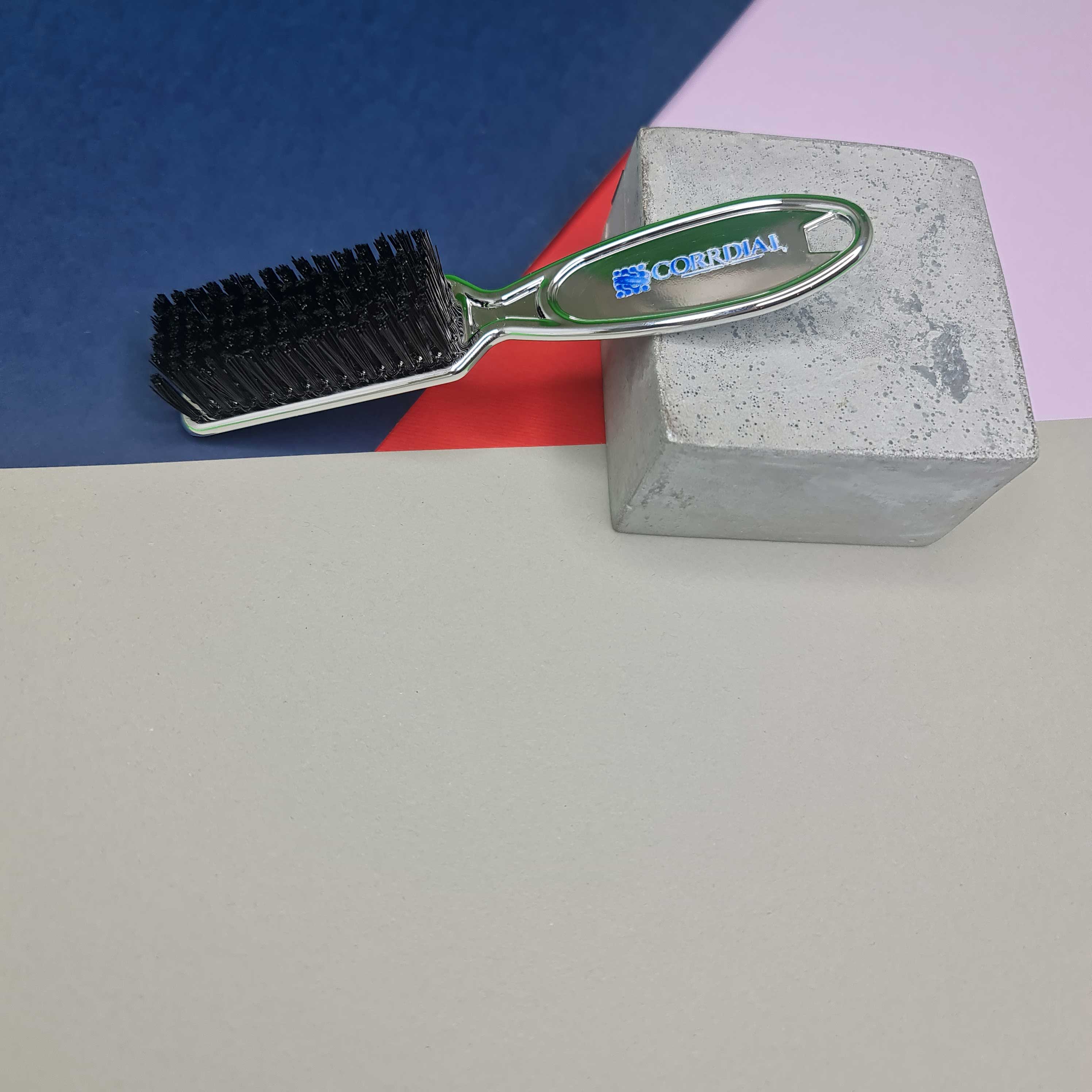 از این برس برای ایجاد خطوط تمیز، طراحی ریش و مرتب کردن موهای زاید در نواحی باریک استفاده می شود. از ویژگی های آن می توان به اندازه کوچک و جمع و جور، موهای متراکم و مقاوم، دسته های باریک و ارگونومیک و قابلیت شستشوی آن اشاره کرد. از دیگر کاربردهای آن می توان طراحی ریش و سبیل، تمیز کردن تیغ، ماشین های اطلاح، قیچی و حذف پودر رنگ یا موهای اصلاح شده اشاره کرد. قابل ذکر است با توجه به انواع بیماری های پوستی و نحوه انتشار آنها و ماندگاری بر روی ابزارها پیشنهاد می شود، ابزار ها با برس های شخصی نظافت شده و موادی مانند الکل ضد عفونی شود.